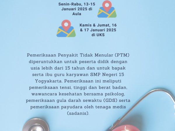 SMP Negeri 15 Yogyakarta baru saja melaksanakan agenda screening kesehatan yang diselenggarakan oleh Puskesmas Danurejan selama sepekan, mulai Senin-Jumat, 13..