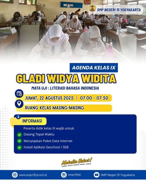 Tes Kompetensi Akademik (TKA) di tahun pelajaran 2025/2026 ini menjadi salah satu hal yang akan dihadapi murid kelas IX. Guna mempersiapkannya, diperlukan pembimbingan dan pelatihan rutin. Untuk itu, SMP Negeri 15 Yogyakarta mengadakan kegiatan Gladi Widya Widita di setiap pekannya. Gladi Widya Widita merupakan pembekalan akademik melalui latihan-latihan soal yang dikerjakan setiap hari Jumat mulai pukul 07.00 – 07.50 WIB.