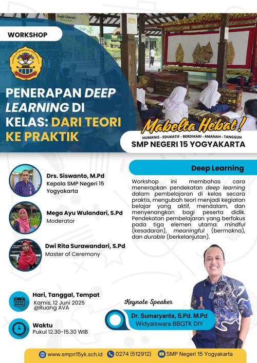 Melalui kegiatan Workshop dan Sarasehan ini, SMP Negeri 15 Yogyakarta tidak hanya berupaya meningkatkan kompetensi individu, tetapi juga mempererat jejaring internal yang menjadi fondasi utama dalam membangun sekolah yang berkualitas, inklusif, dan berdaya tahan terhadap perubahan zaman. Sekolah percaya bahwa kolaborasi, komunikasi, dan kesadaran kolektif dari seluruh warga sekolah adalah kunci utama keberhasilan pendidikan yang berkelanjutan. (Erika)