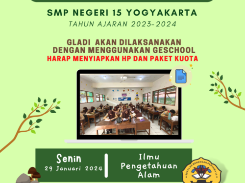 Kegiatan Upacara Bendera di SMP Negeri 15 Yogyakarta akan dilaksanakan pada Senin, 12 Januari 2026, pukul 07.00–07.50 WIB di lapangan sekolah. Petugas upacara berasal dari kelas VII J dengan pembina Desty Nasiratun Nisa’, S.Pd.