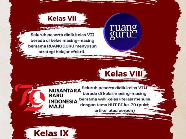 Pesantren Ramadan & Doa Bersama Kelas VII SMP Negeri 15 Yogyakarta akan dilaksanakan pada Senin, 2 Maret 2026, mulai pukul 14.00 WIB. Kegiatan meliputi presensi kehadiran, tadarus Al-Qur’an, sholat Ashar berjamaah, tadarus bersama, kajian Ramadan, berbagi takjil, buka puasa bersama, serta sholat Isya dan Tarawih berjamaah. Melalui kegiatan ini, diharapkan peserta didik dapat meningkatkan keimanan dan ketakwaan, mempererat kebersamaan, serta menumbuhkan kepedulian sosial di bulan suci Ramadan. Semoga seluruh rangkaian kegiatan berjalan dengan lancar dan membawa keberkahan bagi kita semua.