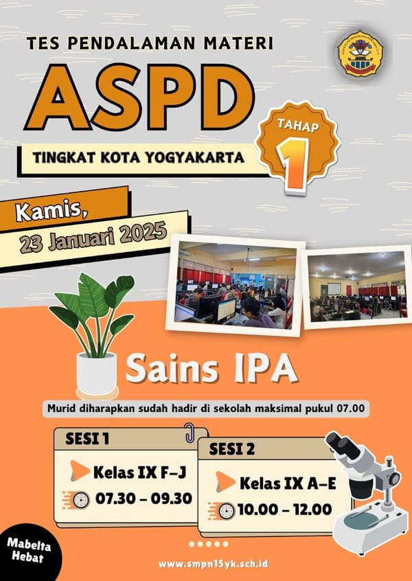 • Murid kelas IX SMP Negeri 15 Yogyakarta telah menyelesaikan Tes Kemampuan Akademik Daerah (TKAD). Semoga segala usaha, doa, dan perjuangan selama ini membuahkan hasil terbaik. Tetap semangat menatap langkah selanjutnya, percaya diri, dan yakin pada kemampuan diri sendiri. Sukses selalu untuk generasi hebat Mabelta! ✨