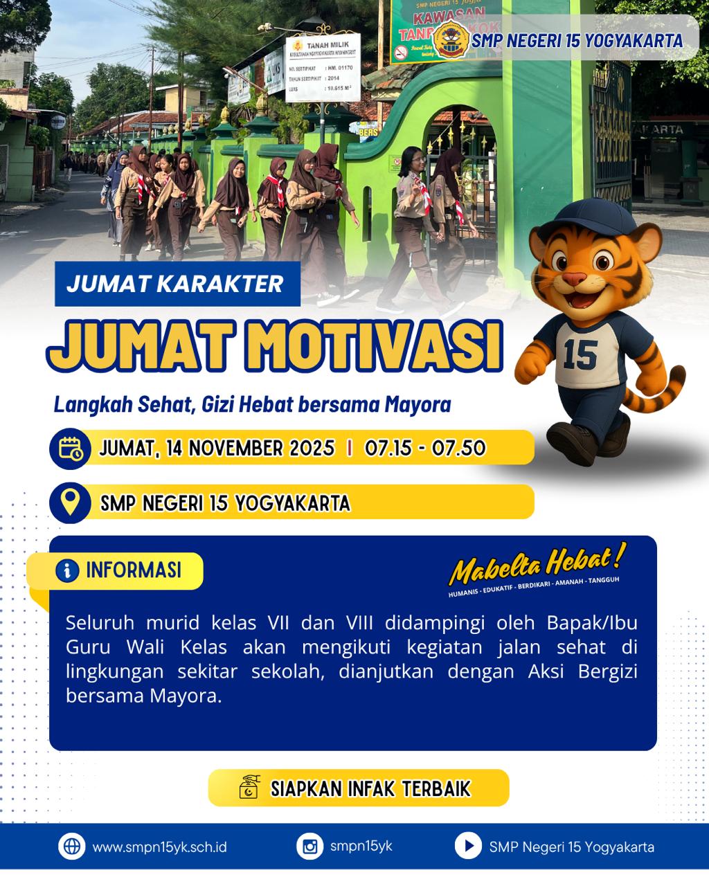 JUMAT KARAKTER – JUMAT MOTIVASI! Jumat Motivasi: Membangun Karakter Tangguh, Mandiri, dan Siap Masa Depan. Jumat, 13 Februari 2026 | 07.00–07.50 WIB SMP Negeri 15 Yogyakarta Dengan semangat berbeda di setiap jenjang: Kelas VII berkemah Widya Widita 🌿 Kelas VIII persiapan dini TKA bersama tim GO πŸ“š Kelas IX Gladi Widya Widita Matematika ✏️ Bersama, kita tumbuh menjadi generasi Mabelta Hebat! πŸ’™