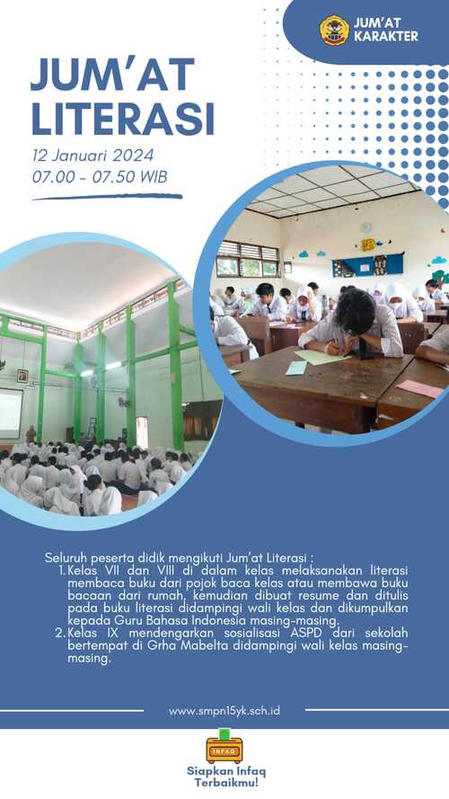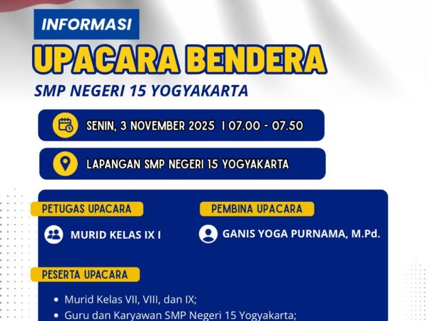JUMAT KARAKTER – JUMAT MOTIVASI! Jumat Motivasi: Membangun Karakter Tangguh, Mandiri, dan Siap Masa Depan. Jumat, 13 Februari 2026 | 07.00–07.50 WIB SMP Negeri 15 Yogyakarta Dengan semangat berbeda di setiap jenjang: Kelas VII berkemah Widya Widita 🌿 Kelas VIII persiapan dini TKA bersama tim GO πŸ“š Kelas IX Gladi Widya Widita Matematika ✏️ Bersama, kita tumbuh menjadi generasi Mabelta Hebat! πŸ’™