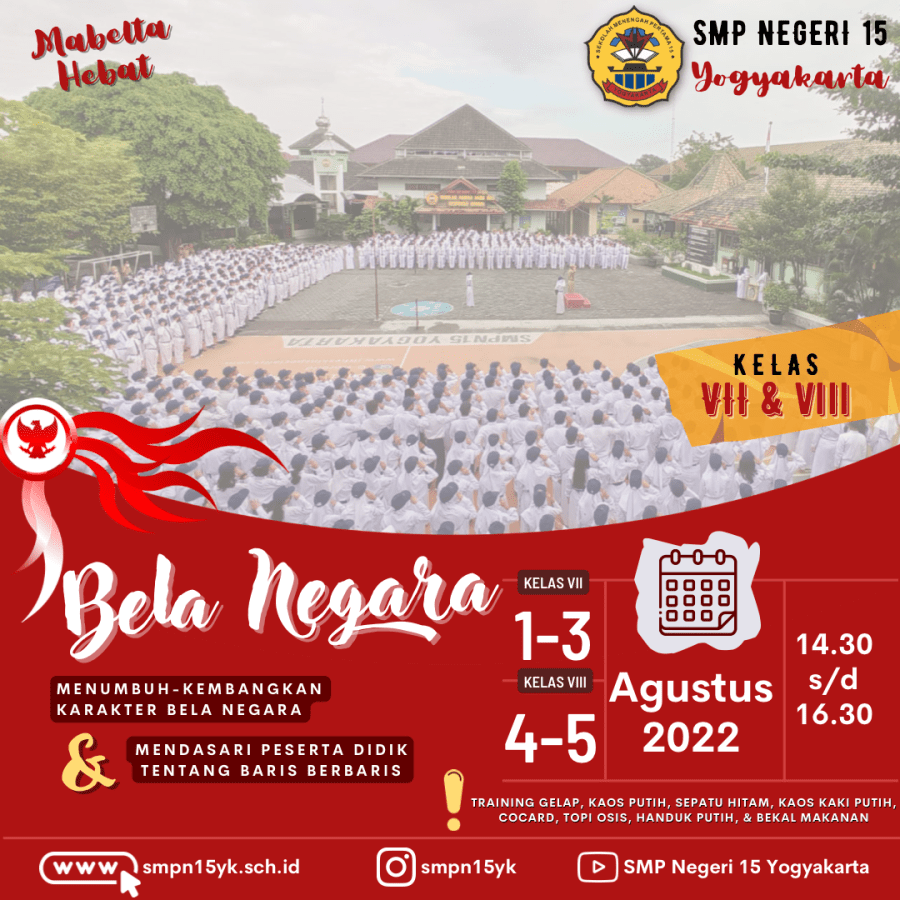 Kegiatan Upacara Bendera di SMP Negeri 15 Yogyakarta akan dilaksanakan pada Senin, 12 Januari 2026, pukul 07.00–07.50 WIB di lapangan sekolah. Petugas upacara berasal dari kelas VII J dengan pembina Desty Nasiratun Nisa’, S.Pd.