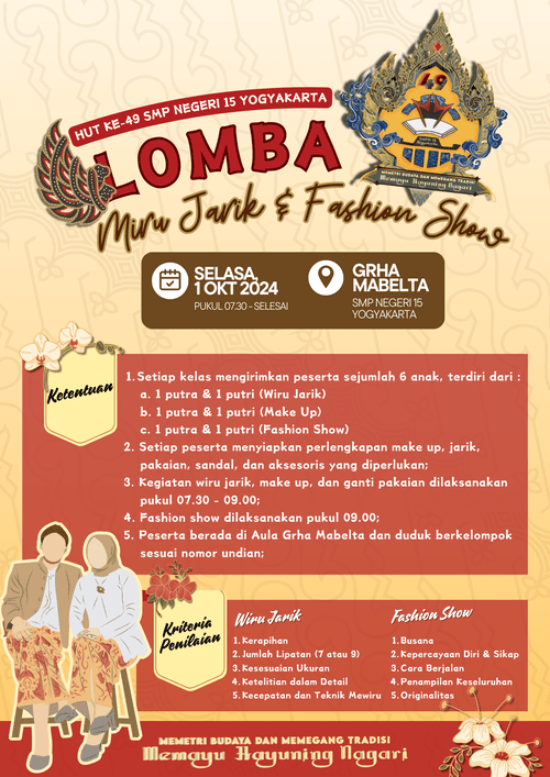 Memperingati Hari Jadi ke-271 DIY Tahun 2026 🎉 “Mulat Sarira Jumangkah Jantraning Laku”“Mulat Sarira Jumangkah Jantraning Laku” Poster digital ini adalah karya dari Gwein Arneita dari kelas 8i