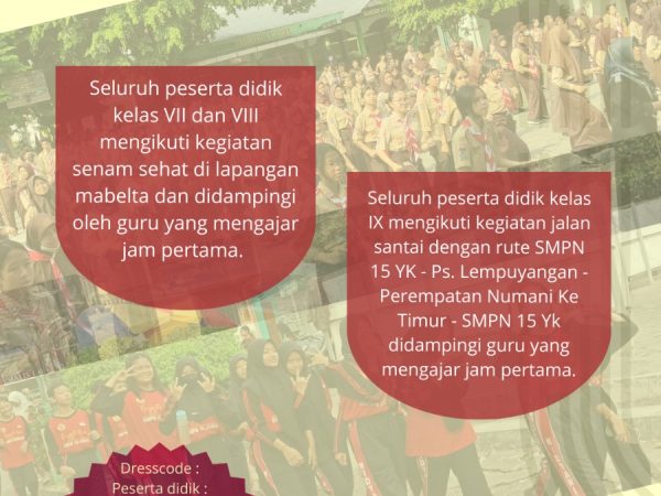 • Pesantren Ramadan & Doa Bersama Kelas VII SMP Negeri 15 Yogyakarta akan dilaksanakan pada Senin, 2 Maret 2026, mulai pukul 14.00 WIB.