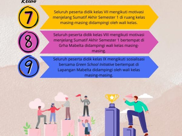 Pesantren Ramadan & Doa Bersama Kelas VII SMP Negeri 15 Yogyakarta akan dilaksanakan pada Senin, 2 Maret 2026, mulai pukul 14.00 WIB. Kegiatan meliputi presensi kehadiran, tadarus Al-Qur’an, sholat Ashar berjamaah, tadarus bersama, kajian Ramadan, berbagi takjil, buka puasa bersama, serta sholat Isya dan Tarawih berjamaah. Melalui kegiatan ini, diharapkan peserta didik dapat meningkatkan keimanan dan ketakwaan, mempererat kebersamaan, serta menumbuhkan kepedulian sosial di bulan suci Ramadan. Semoga seluruh rangkaian kegiatan berjalan dengan lancar dan membawa keberkahan bagi kita semua.