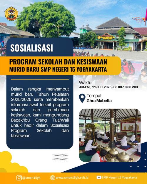 • Pesantren Ramadan & Doa Bersama Kelas VII SMP Negeri 15 Yogyakarta akan dilaksanakan pada Senin, 2 Maret 2026, mulai pukul 14.00 WIB.