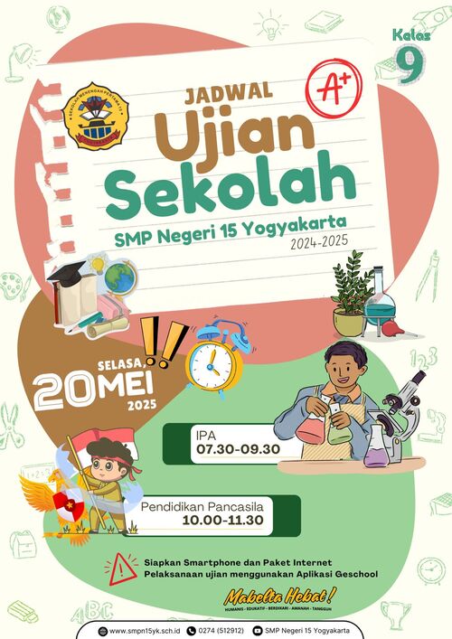 JUMAT KARAKTER – JUMAT MOTIVASI! Jumat Motivasi: Membangun Karakter Tangguh, Mandiri, dan Siap Masa Depan. Jumat, 13 Februari 2026 | 07.00–07.50 WIB SMP Negeri 15 Yogyakarta Dengan semangat berbeda di setiap jenjang: Kelas VII berkemah Widya Widita 🌿 Kelas VIII persiapan dini TKA bersama tim GO πŸ“š Kelas IX Gladi Widya Widita Matematika ✏️ Bersama, kita tumbuh menjadi generasi Mabelta Hebat! πŸ’™