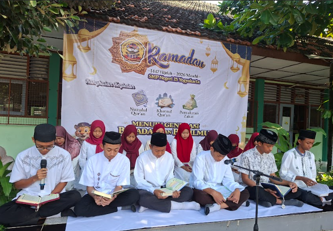 (Yogyakarta, 13 Maret 2026) ~ Masih dalam bulan suci Ramadan, SMP Negeri 15 Yogyakarta terus mengisi bulan suci ini dengan kegiatan-kegiatan keagamaan yang penuh manfaat. Kegiatan tersebut beberapa di antaranya adalah Khotaman Al-Qur’an dan Peringatan Nuzulul Qur’an yang diselenggarakan bersamaan dengan agenda Jumat Religi. Kegiatan ini bertujuan menumbuhkan rasa cinta terhadap Al-Qur’an sehingga dapat menjadikan Al-Qur’an sebagai bacaan utama dalam kehidupan sehari-hari baik dalam bulan Ramadan maupun bulan-bulan lainnya.