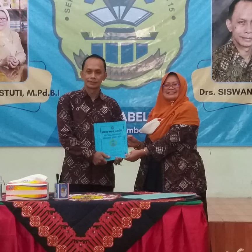 Kamis, 30 Desember 2021 telah dilaksanakan serah terima jabatan kepala SMP Negeri 15 Yoyakarta yang dilaksanakan di Aula SMP Negeri 15 Yogyakarta. Acara serah terima jabatan (sertijab) Kepala Sekolah lama yaitu Siti Arina Budiastuti , M.Pd.B.I kepada kepala sekolah baru yaitu Drs. Siswanto, M.Pd. Acara tersebut dihadiri oleh perwakilan peserta didik, guru, komite sekolah, Pengawas Pembina, dan Kepala Dinas Pendidikan Pemuda dan Olahraga Kota Yogyakarta.