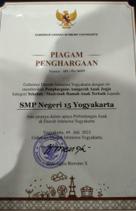 Minggu 6 Agustus 2023-SMPN 15 Yogyakarta dianugerahkan menjadi Sekolah Ramah Anak Terbaik Provinsi Daerah Istimewa Yogyakarta.