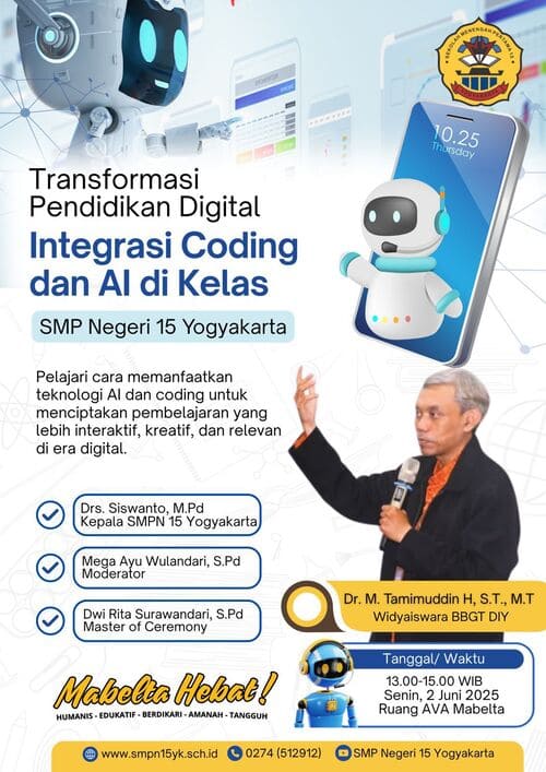 Yogyakarta, 2 Juni 2025 — Dalam rangka menjawab tantangan pendidikan di era digital yang terus berkembang pesat, SMP Negeri 15 Yogyakarta menyelenggarakan kegiatan inovatif bertajuk “Transformasi Pendidikan Digital: Integrasi Coding dan AI di Kelas” bagi Bapak dan Ibu guru. Kegiatan ini berlangsung di Ruang AVA Mabelta, Senin (2/6/2025), pukul 13.00–15.00 WIB, dan menjadi momentum penting bagi para guru untuk memperkaya wawasan dan kompetensi mereka dalam menghadapi dinamika pembelajaran abad ke-21.